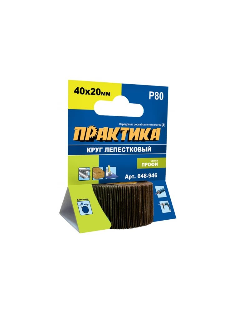 Круги лепестковые абразивные для дрелей и прямых шлифмашин. ГОСТ 22775-77. Серия "Профи". Круг лепестковый шлифовальный с оправкой предназначен для шлифования поверхности изделий из металла, дерева и пластика, снятия с них краски, лаков, ржавчины, окалины и заусенцев с помощью прямой шлифовальной машины или дрели с высокими оборотами. Подходит для обработки плоских, криволинейных и внутренних поверхностей. Изготовлен из абразивного материала на тканевой основе. Лепестковый круг с оправкой 40х20 мм, P80, хвостовик 6 мм — для точной шлифовки и зачистки труднодоступных мест по металлу, дереву и пластику.