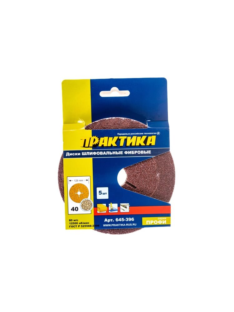 Круги фибровые ПРАКТИКА, гибкие с центральным отверстием, 125 мм (P40), 5 шт в Солнечный