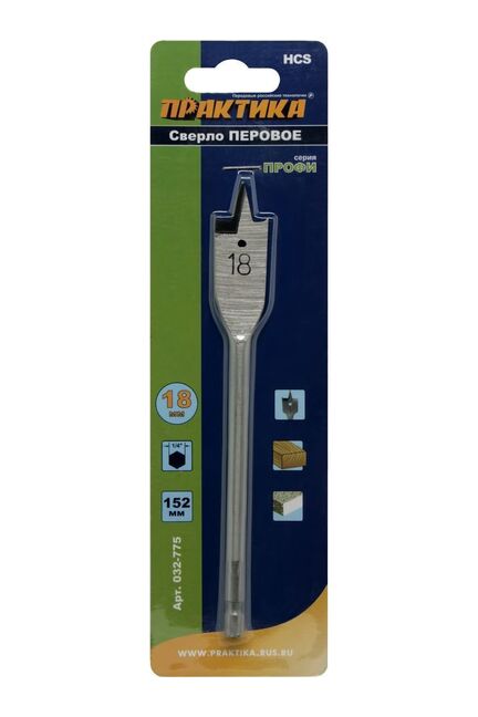 шестигранный хвостовик 1/4" Перовое сверло 18×152 мм для чистого сверления дерева, устойчивая закалка, быстрая работа. Подходит для мягких и твердых пород.