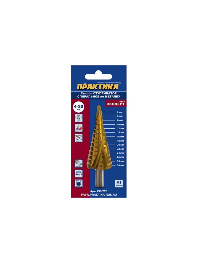 Сверло по металлу ступенчатое спиральное ПРАКТИКА ЭКСПЕРТ, 4-30 мм, шаг 2 мм, хвост 1/4