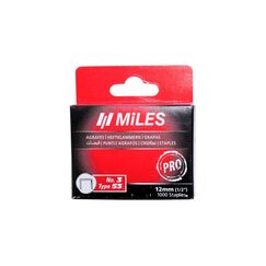 Скобы тип 53 Miles N3-12-D предназначены для степлеров MiLES TP-5525, TP-5560, TP-5561, TS-5580, TS-5592, TS-5595, TP-6001, TA-5596, TS-5585K, TA-5597, TPS-5550, TS-5552. Применяются для скрепления между собой различных материалов. Скобы изготовлены из среднеуглеродистой стали, закалены, заострены и оцинкованы. Количество в упаковке – 1000 шт. Скобы, тип 53, 12 мм, из закалённой стали для степлеров, антикоррозионные, подходит для обивки, фиксации плёнки, ткани и изоляции.
