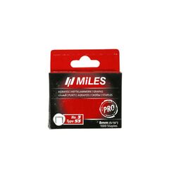 Скобы тип 53 Miles N3-8-D предназначены для степлеров MiLES TP-5525, TP-5560, TP-5561, TS-5580, TS-5592, TS-5595, TP-6001, TA-5596, TS-5585K, TA-5597, TPS-5550, TS-5552. Применяются для скрепления между собой различных материалов. Скобы изготовлены из среднеуглеродистой стали, закалены, заострены и оцинкованы. Количество в упаковке – 1000 шт. Закалённые скобы тип 53, 8 мм, 1000 шт: для прочного крепления тканей, кожи, древесины. Не деформируются, подходят для большинства степлеров.