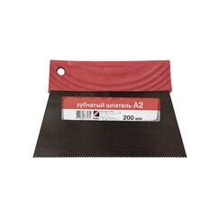 Полотно шпателя изготовлено из нержавеющей стали. Оснащен эргономичной ручкой. Шпатель предназначен для нанесения, выравнивания и сглаживания шпаклевочного слоя на большой поверхности. Зубчатый шпатель 200 мм из нержавеющей стали с зубом 10×10 мм, удобная пластиковая ручка, идеален для равномерного нанесения клея.