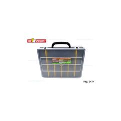 Универсальный малый органайзер 36 х 28 х 7 см удобен для хранения и транспортировки небольших объемов крепежа, шайб, прокладок и иных мелочей. Для практичности крышка выполнена из полупрозрачного пластика. Удобный органайзер 36х28х7 см для сортировки крепежа и инструмента. Прочный пластик, прозрачная крышка, надежные замки, удобная переноска.