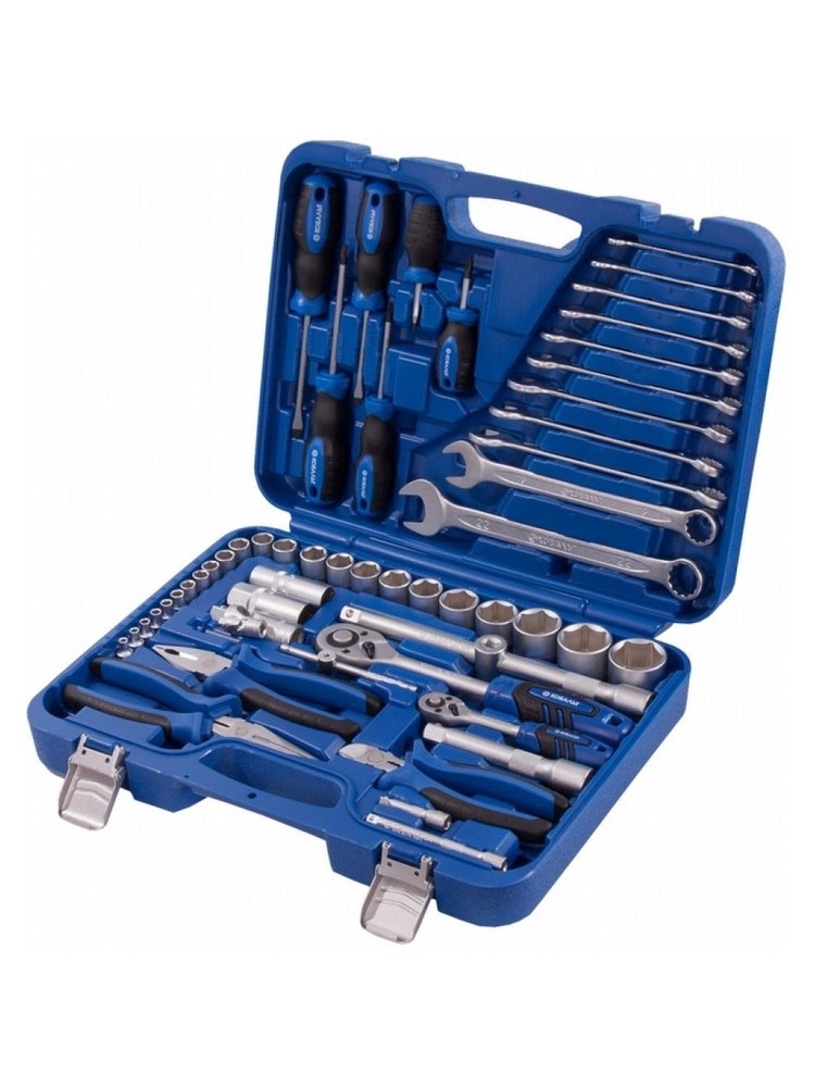 Универсальный набор инструмента КОБАЛЬТ применяется при ремонте и столярно-слесарных работах. Комплектация позволяет выполнять широкий спектр задач. Длительный срок службы обеспечен материалом изготовления - устойчивой к деформации хромованадиевой сталью. Для уверенного хвата инструмента и удобства работы рукоятки выполнены из двухкомпонентного пластика. Набор поставляется в прочном пластиковом кейсе для хранения и транспортировки. Универсальный набор из 55 предметов 1/4" и 1/2", CrV сталь, кейс, для монтажа, ремонта и обслуживания в быту и на производстве.