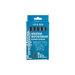 Материал: воск, пигмент. Применяются для нанесении маркировки на влажные и сухие поверхности. Подходят дла разметке на металле, бетоне, пластике, керамике и стекле. Чёрные восковые мелки 120 мм для чёткой разметки на любых поверхностях. Прочные, не крошатся, устойчивы к стиранию. В комплекте 6 штук.