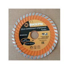 Серия «Мастер». Тип TURBO. Сегмент 10 мм. ГОСТ 10110-87. Алмазные диски для широкого спектра строительных материалов: кирпич, бетон, искусственный и натуральный камень. Очень высокая скорость резания. Для ручного электроинструмента. Способны разрезать тонкую арматуру в бетоне. Не для абразивных материалов. Сухой рез. Охлаждение водой увеличивает ресурс диска. Быстрый и точный рез керамики, камня и бетона, усиленный турбо сегмент, диаметр 125 мм, для профессионалов и ремонта.