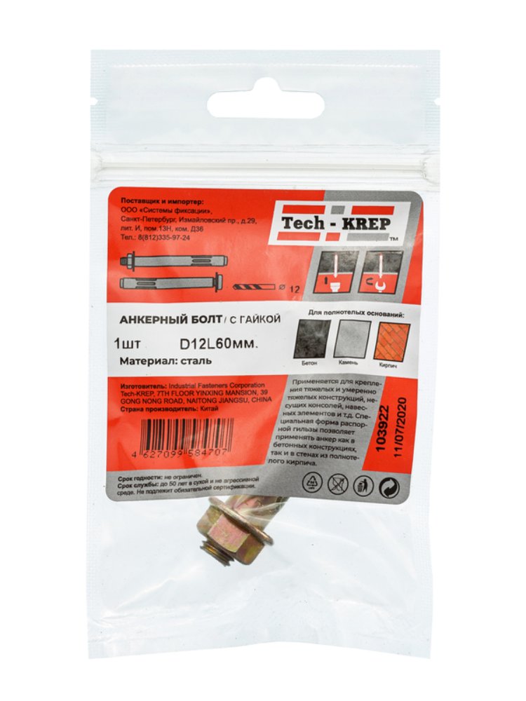 Анкерный болт с гайкой 12х60 от Tech-Krep – это надежный крепежный элемент, предназначенный для монтажа конструкций в бетон, кирпич или природный камень. Изготовлен из высокопрочной стали с антикоррозийным покрытием, что обеспечивает долговечность даже в условиях повышенной влажности. Диаметр болта 12 мм и длина 60 мм позволяют использовать его для крепления тяжелых конструкций. В комплекте поставляется гайка для удобной фиксации. Упаковка – пакет, 1 штука.