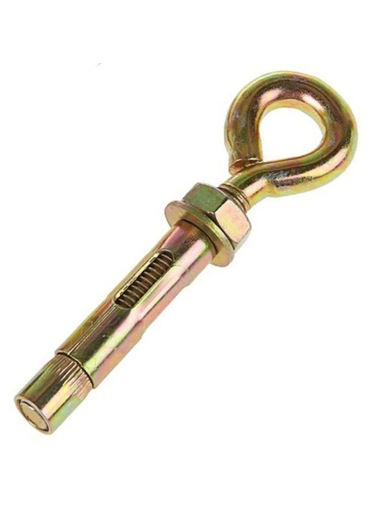 Анкерный болт с кольцом для крепления тяжелых подвесных конструкций к плотным строительным материалам. Для надёжной фиксации в бетоне и кирпиче, нагрузка до 350 кг, оцинкованная сталь, удобное крепление тросов и цепей, монтаж без усилий.
