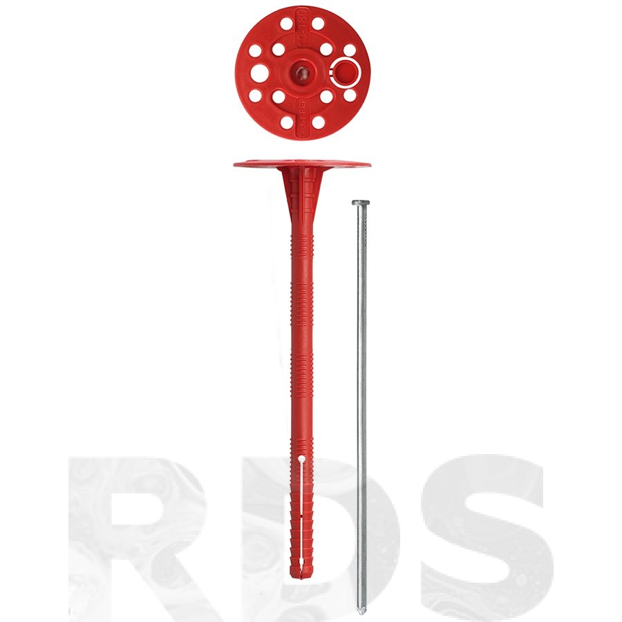 Дюбель крепления теплоизоляции с металлическим гвоздём. Материал - полипропилен Борт – потайной. Дюбель предназначен для крепления тяжелых видов термоизоляционных материалов к бетонному или кирпичному основанию. Шляпка дюбеля способствует надежному удержанию материала теплоизоляции, препятствуя прорыву в месте крепления. Ребра перед распорной зоной препятствуют проваливанию дюбеля в просверленное отверстие. Надежная фиксация утеплителя к бетону и кирпичу, длина 300 мм, крепеж из прочного пластика, 400 шт в упаковке для удобства монтажа.