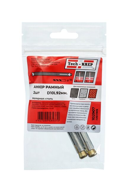 Металлический рамный дюбель 10х92 мм от Tech-Krep предназначен для надежного крепления тяжелых конструкций к полнотелым основаниям, таким как бетон, кирпич или природный камень. Изготовлен из прочной стали с антикоррозийным покрытием, что гарантирует долговечность и устойчивость к воздействию окружающей среды. Комплект из 2 штук поставляется в удобном пакете, что упрощает хранение и транспортировку. Дюбель обеспечивает высокую прочность соединения благодаря своей конструкции с распорным механизмом, что делает его идеальным для монтажа рам, профилей и других строительных элементов.