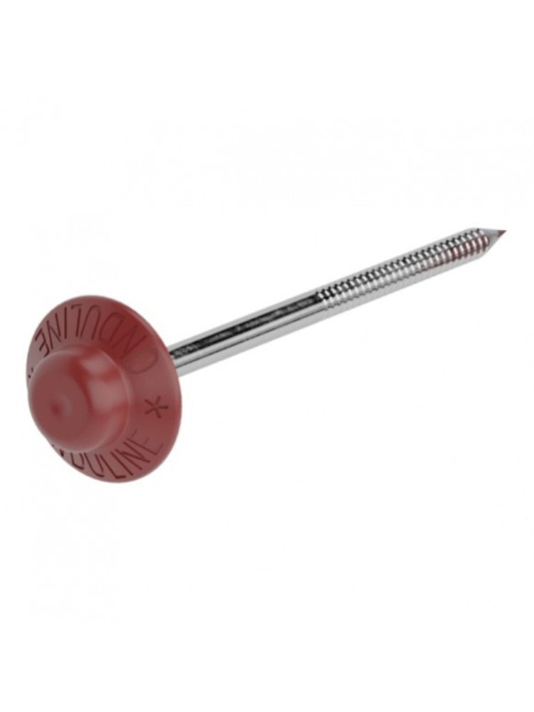 Гвозди для ондулина состоят собственно из стержня и съемного колпачка-шляпки. Длина крепежного элемента 75 мм, диаметр 3,55 мм. Материал гвоздя – углеродистая сталь с покрытием пассивированным цинком во избежание коррозии, а шляпки могут быть как из полипропилена, так и из ПВХ (поливинилхлорид). Оба пластика устойчивы к ультрафиолету, поэтому «узких» мест на кровле, при условии соблюдения герметичности во время монтажа, практически нет. Основное требование – правильное забивание гвоздей на выров Крепеж с широкой цветной шляпкой для кровли ондулин, оцинкованный, надёжно защищает от коррозии и протечек, обеспечивает долговечный монтаж.