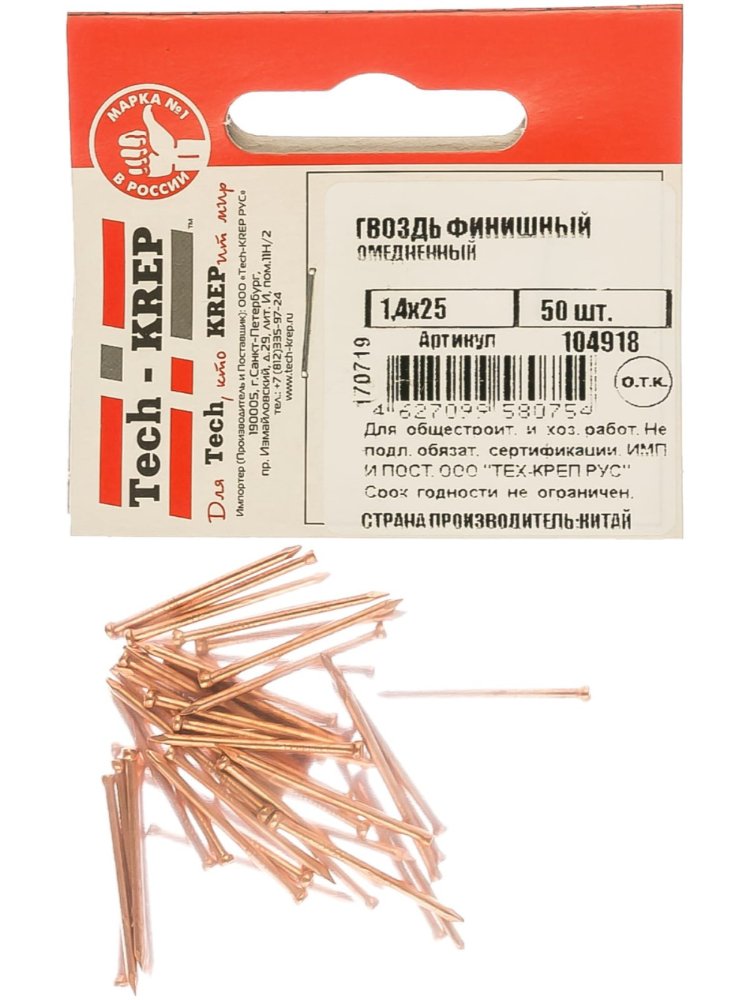 Финишный бронзовый гвоздь размером 1,4х25 мм в упаковке 50 штук от Tech-Krep представляет собой надежный крепежный элемент, предназначенный для выполнения отделочных работ. Изготовлен из высококачественной стали с бронзовым покрытием, что обеспечивает устойчивость к коррозии и эстетичный внешний вид. Маленькая шляпка гвоздя практически незаметна после забивания, что идеально подходит для декоративных и финишных креплений. Длина 25 мм и диаметр 1,4 мм гарантируют прочное соединение без повреждения материала.
