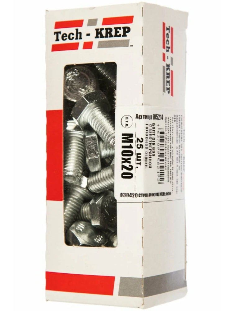 Болт с шестигранной головкой DIN 933, оцинкованный, размером М10х20, в упаковке 25 штук в коробке с окном от Tech-Krep — это надежный крепежный элемент, выполненный из высококачественной стали с цинковым покрытием для защиты от коррозии. Предназначен для создания прочных разъемных соединений в различных конструкциях. Метрическая резьба обеспечивает точную и надежную фиксацию. Подходит для использования с гайками и шайбами соответствующего размера. Удобная упаковка с окном позволяет видеть содержимое и контролировать количество оставшихся изделий.