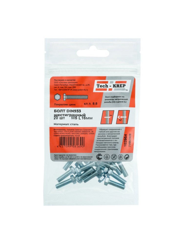 Болт с шестигранной головкой DIN933 оцинкованный М5х16 в упаковке 20 штук от Tech-Krep – это надежный крепежный элемент, изготовленный из углеродистой стали с цинковым покрытием для защиты от коррозии. Размер М5 (диаметр резьбы 5 мм) и длина 16 мм обеспечивают удобство монтажа в различных конструкциях. Шестигранная головка позволяет использовать стандартные ключи или гайковерты для быстрой установки. Подходит для соединения деталей и конструкций, где требуется прочное и долговечное крепление.