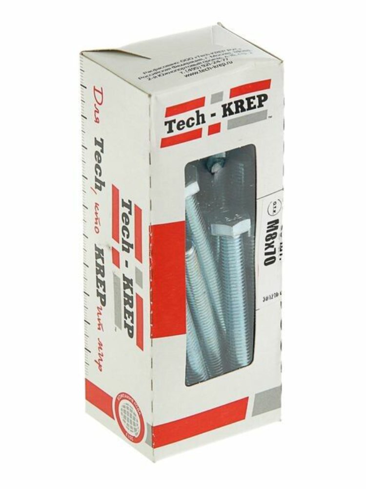 Болт DIN 933 с шестигранной головкой, оцинкованный, М8х70, 20 шт в коробке с окном Tech-Krep. Прочный, устойчивый к коррозии крепеж для строительства и ремонта.