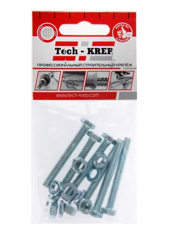 Болт DIN933 с шестигранной головкой оцинк. М6х50 + гайка + шайба(6 шт) - пакет Tech-Krep