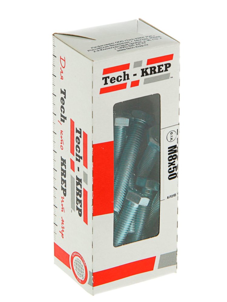 Болт DIN 933 с шестигранной головкой, оцинкованный, М8х50, 20 шт. в коробке с окном от Tech-Krep. Прочный, устойчив к коррозии, для надежного крепления.