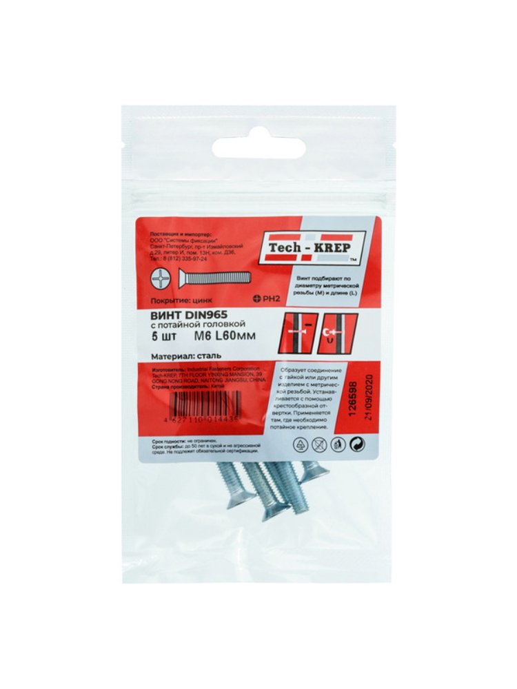 Винт DIN965 с потайной головкой, оцинкованный, М5х60, 6 шт. в упаковке Tech-Krep. Надежный крепеж из стали с защитой от коррозии для стройки и ремонта.