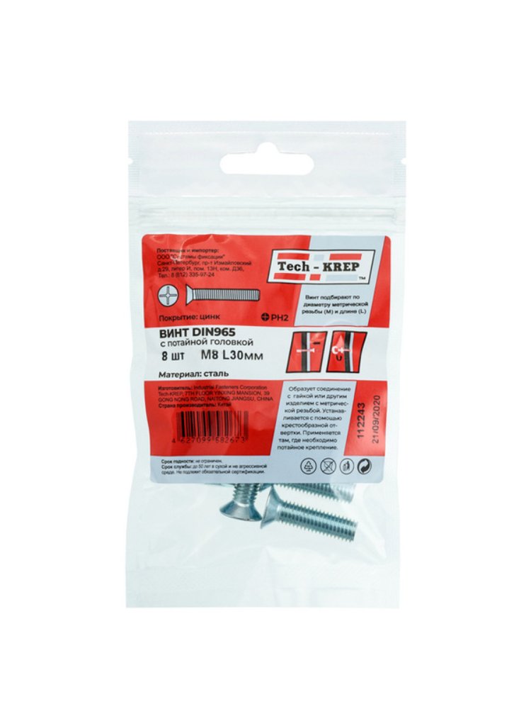 Винт DIN965 с потайной головкой M8х30, оцинкованный, 8 шт. в упаковке Tech-Krep. Прочный, устойчив к коррозии, для надежного крепления.