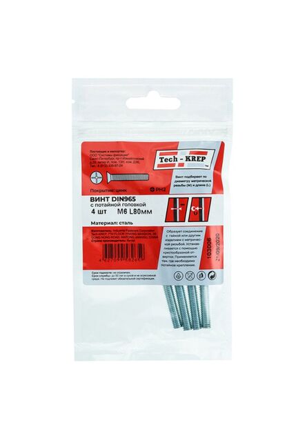 Винт с потайной головкой оцинкованный М6х80 в упаковке 4 штуки от Tech-Krep соответствует стандарту DIN965. Изготовлен из прочной углеродистой стали с цинковым покрытием, что обеспечивает защиту от коррозии и долговечность крепежа. Потайная головка позволяет устанавливать винт заподлицо с поверхностью, обеспечивая аккуратный внешний вид соединения. Подходит для использования с гайками и шайбами соответствующего размера. Диаметр резьбы составляет 6 мм, длина винта — 80 мм, что делает его универсальным решением для различных задач. Тип шлица — крестообразный (Phillips), что упрощает монтаж с помощью стандартных инструментов.