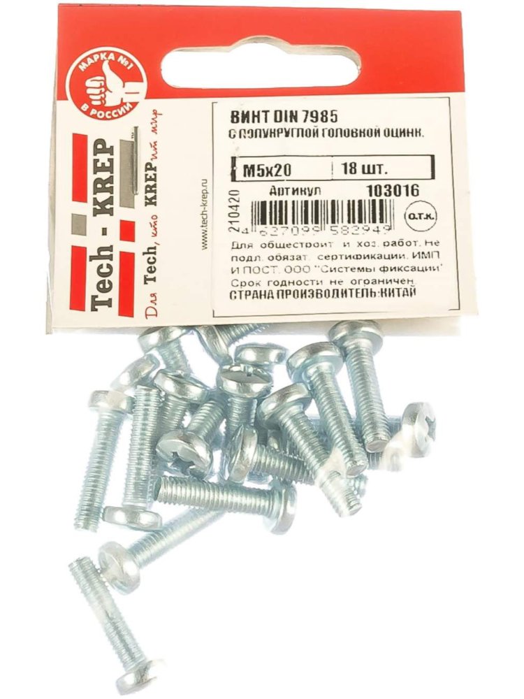 Винт DIN 7985 М5х20 с полукруглой головкой, оцинкованный, в упаковке 18 шт. от Tech-Krep. Прочный, устойчив к коррозии, удобен для монтажа.