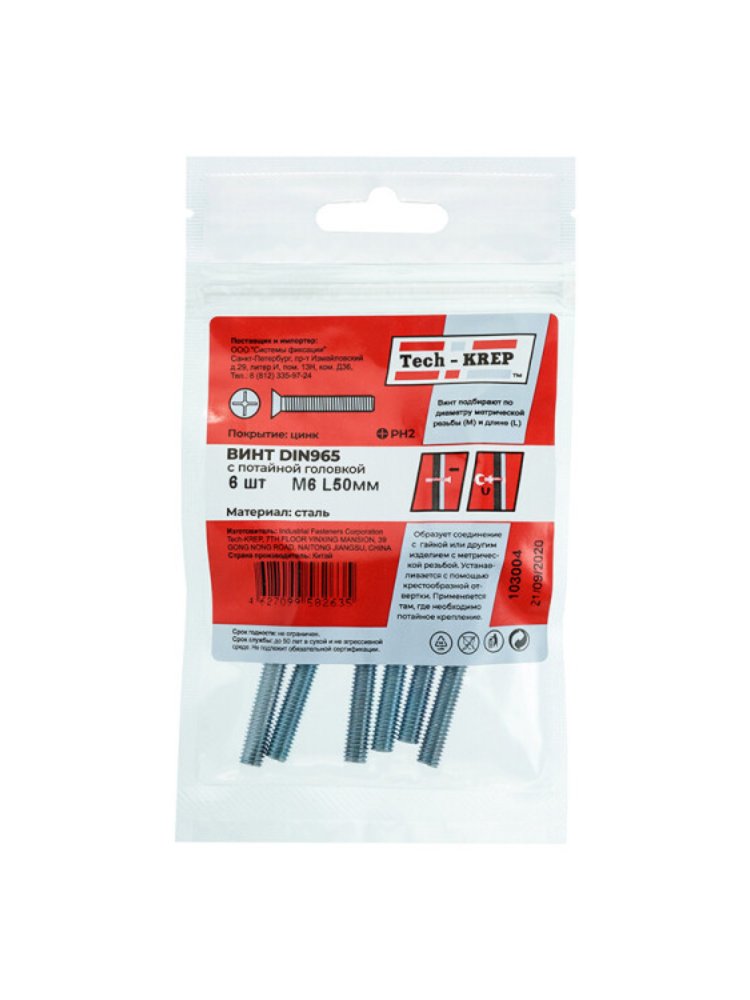 Винт DIN965 с потайной головкой, оцинк., М6х50, 6 шт. в упаковке Tech-Krep. Прочный, устойчивый к коррозии крепеж для скрытого монтажа.