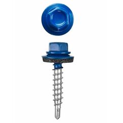 Стальные саморезы с шестигранной со сверловидным наконечником, укомплектованные шайбой с резинкой, для крепления кровельных материалов к деревянной обрещетки. Синий кровельный саморез 4,8×50/51 мм с пресс-шайбой для монтажа металлочерепицы, защищён от коррозии, комплект 1200 шт.