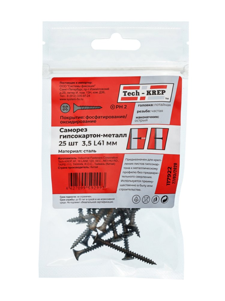 Идеальное решение для прочного и быстрого крепления металлических конструкций в строительстве и ремонте. Саморезы 3,5х41 подходят для монтажа тонколистового металла, профилей, гипсокартона, а также для соединения фрагментов из пластика и дерева без предварительного сверления.