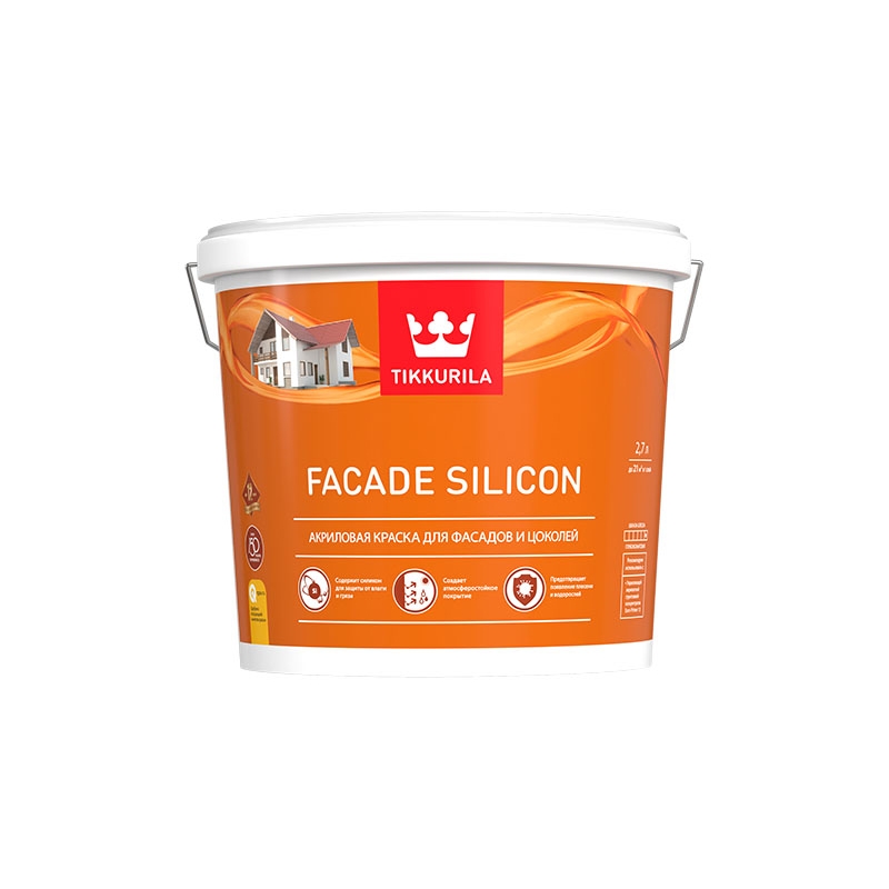 Матовая фасадная краска устойчивая к влаге, не выцветает, подходит для минеральных поверхностей, легко наносится и долго сохраняет цвет.