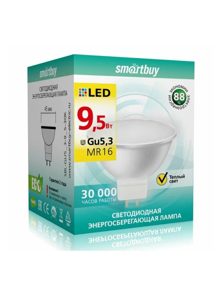 Современное решение для освещения — светодиодная лампа мощностью 9,5 Вт с цоколем GU5.3 и тёплым белым светом 3000K подходит для жилых и коммерческих помещений, офисов, магазинов, а также акцентной и декоративной подсветки.
