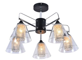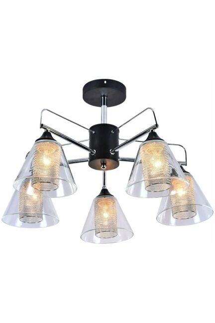 Размеры: (Д*Ш*В) 575*575*350 мм Потолочная люстра на 5 ламп E27 мощностью до 60 Вт, цвет черный/хром, для освещения комнат до 20 м². Современный дизайн, легкий монтаж.
