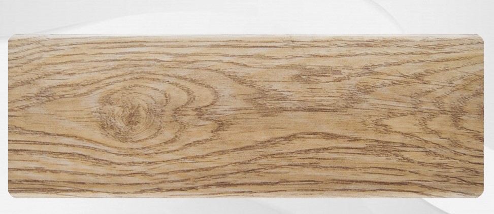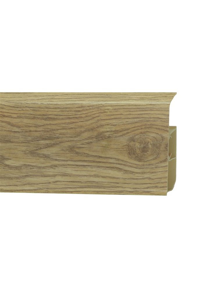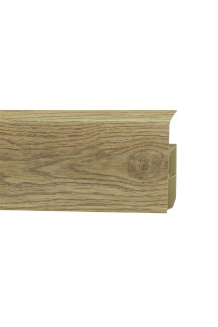 Высокий влагостойкий плинтус 80 мм с тёплой текстурой дуба, легко монтируется и скрывает кабели, защищая стены и подчёркивая стиль интерьера.