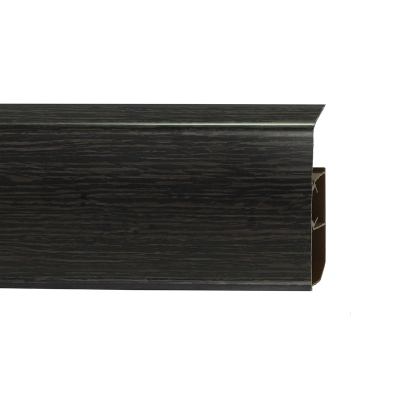 Утонченный и высокий профиль (80 мм) с острыми краями. Благодаря съёмной панели монтаж электрических проводов, покраска стен, оклеивание обоями возможны без демонтажа профилей. Конструкция позволяет монтировать и демонтировать плинтус без использования инструментов. Существует возможность размещения большого количества проводов, в том числе после монтажа. Специальная двухслойная технология: помимо слоя краски, дополнительно покрывается специальным лаком, благодаря чему его покрытие становится однородным, а это дополнительно защищает изделие от разного вида механических повреждений и вредного воздействия лучей УФ. Благодаря эластичному материалу, плинтус идеально прилегает даже к неровностям стен и полов. Широкий и прочный плинтус с элегантной отделкой "Венге Цаво", скрывает зазоры, прост в установке, подходит под любые покрытия и позволяет спрятать провода.