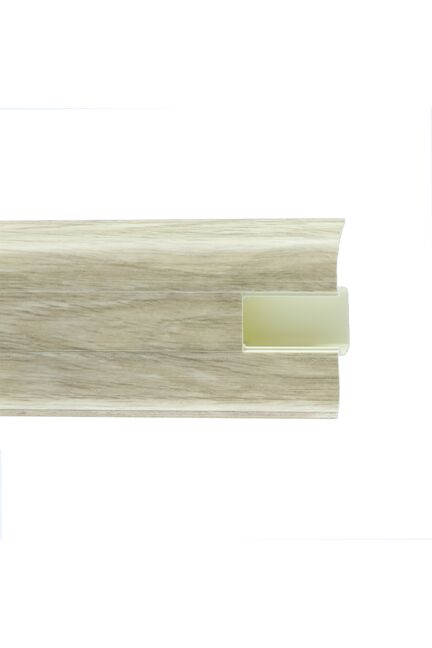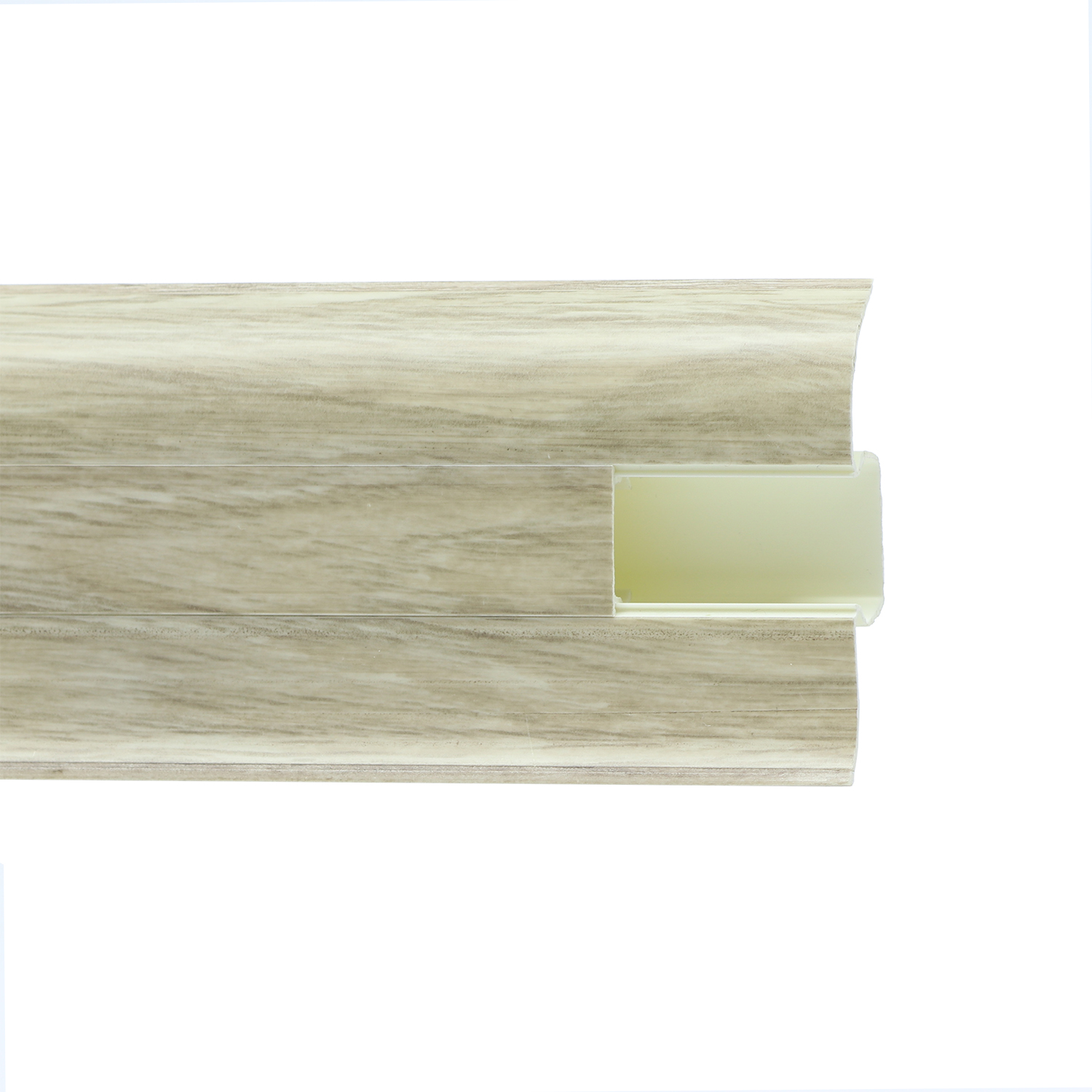Утонченный и высокий профиль (58 мм) с острыми краями. Благодаря съёмной панели монтаж электрических проводов, покраска стен, оклеивание обоями возможны без демонтажа профилей. Конструкция позволяет монтировать и демонтировать плинтус без использования инструментов. Существует возможность размещения большого количества проводов, в том числе после монтажа. Специальная двухслойная технология: помимо слоя краски, дополнительно покрывается специальным лаком, благодаря чему его покрытие становится однородным, а это дополнительно защищает изделие от разного вида механических повреждений и вредного воздействия лучей УФ. Благодаря эластичному материалу, плинтус идеально прилегает даже к неровностям стен и полов. Влагостойкий плинтус 2,5 м, высота 58 мм, декор дуб рене, прочный материал, скрытое крепление, для жилых и коммерческих интерьеров.