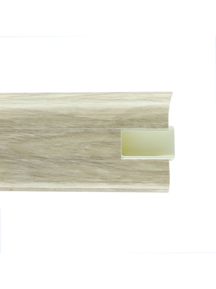 Утонченный и высокий профиль (58 мм) с острыми краями. Благодаря съёмной панели монтаж электрических проводов, покраска стен, оклеивание обоями возможны без демонтажа профилей. Конструкция позволяет монтировать и демонтировать плинтус без использования инструментов. Существует возможность размещения большого количества проводов, в том числе после монтажа. Специальная двухслойная технология: помимо слоя краски, дополнительно покрывается специальным лаком, благодаря чему его покрытие становится однородным, а это дополнительно защищает изделие от разного вида механических повреждений и вредного воздействия лучей УФ. Благодаря эластичному материалу, плинтус идеально прилегает даже к неровностям стен и полов. Влагостойкий плинтус 2,5 м, высота 58 мм, декор дуб рене, прочный материал, скрытое крепление, для жилых и коммерческих интерьеров.