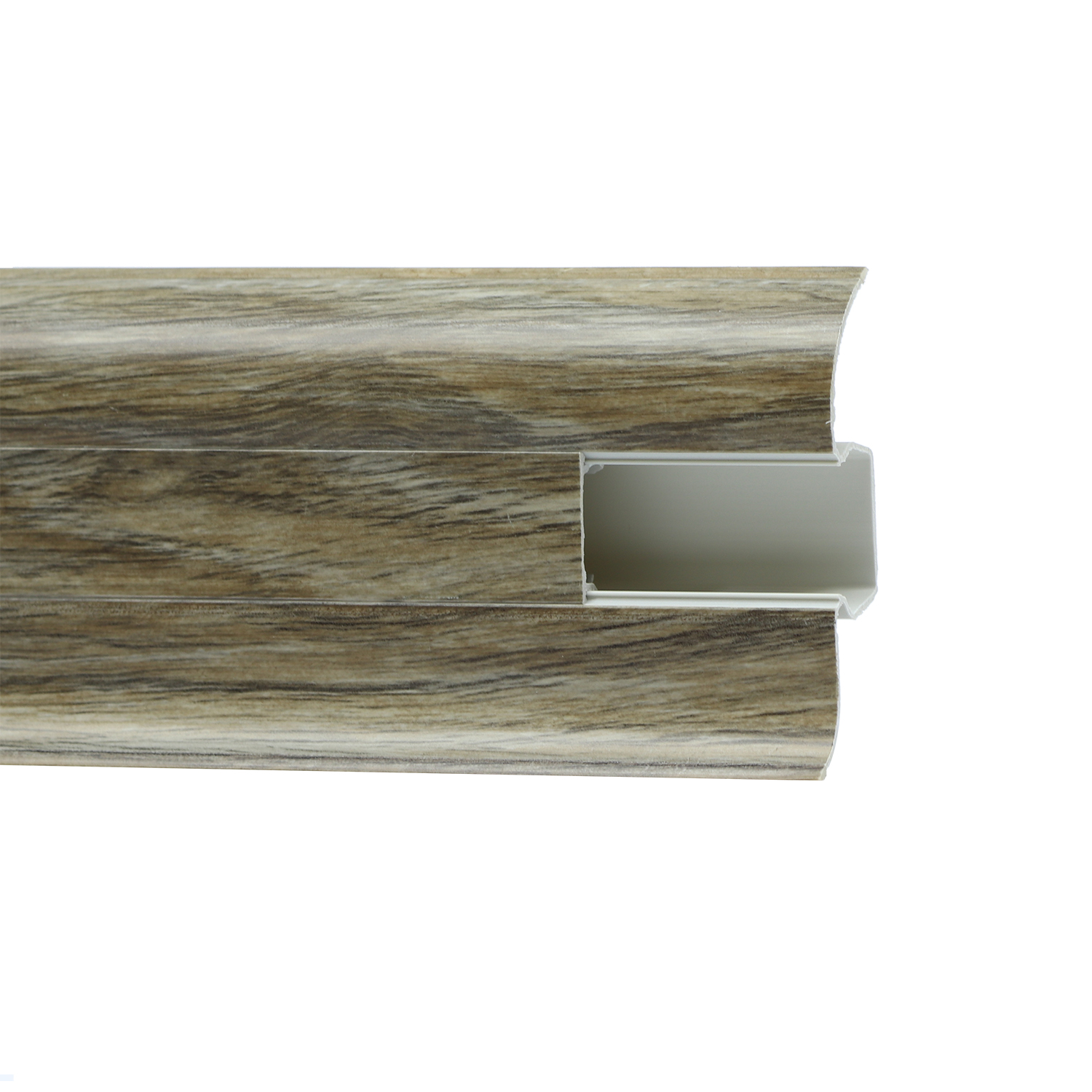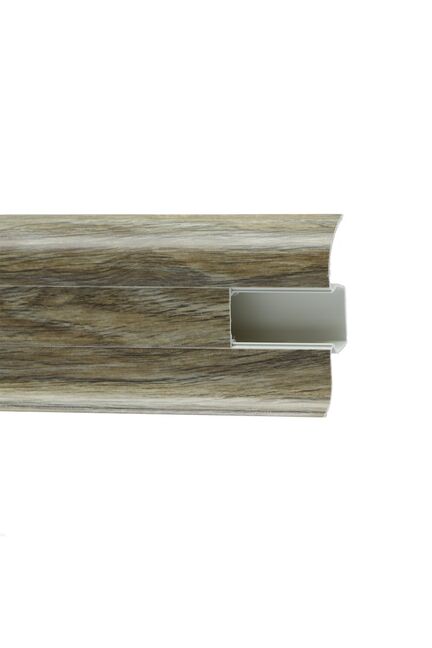 Утонченный и высокий профиль (58 мм) с острыми краями. Благодаря съёмной панели монтаж электрических проводов, покраска стен, оклеивание обоями возможны без демонтажа профилей. Конструкция позволяет монтировать и демонтировать плинтус без использования инструментов. Существует возможность размещения большого количества проводов, в том числе после монтажа. Специальная двухслойная технология: помимо слоя краски, дополнительно покрывается специальным лаком, благодаря чему его покрытие становится однородным, а это дополнительно защищает изделие от разного вида механических повреждений и вредного воздействия лучей УФ. Благодаря эластичному материалу, плинтус идеально прилегает даже к неровностям стен и полов. Плинтус ПВХ 58мм, 2,5м, влагостойкий, с каналом для кабеля, под дуб, легко монтируется и защищает стыки пола и стен.
