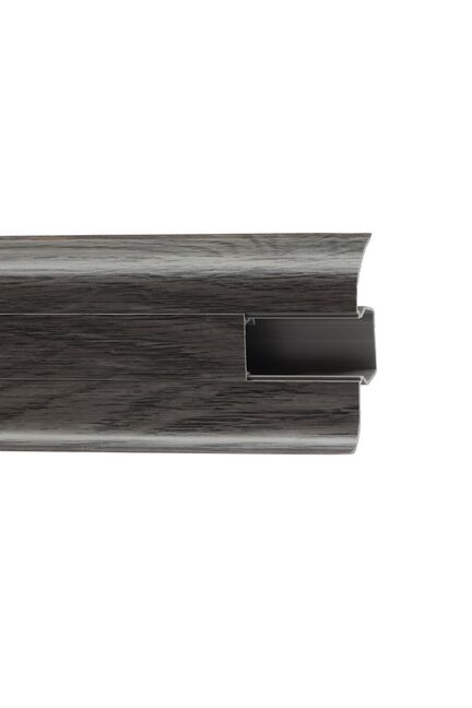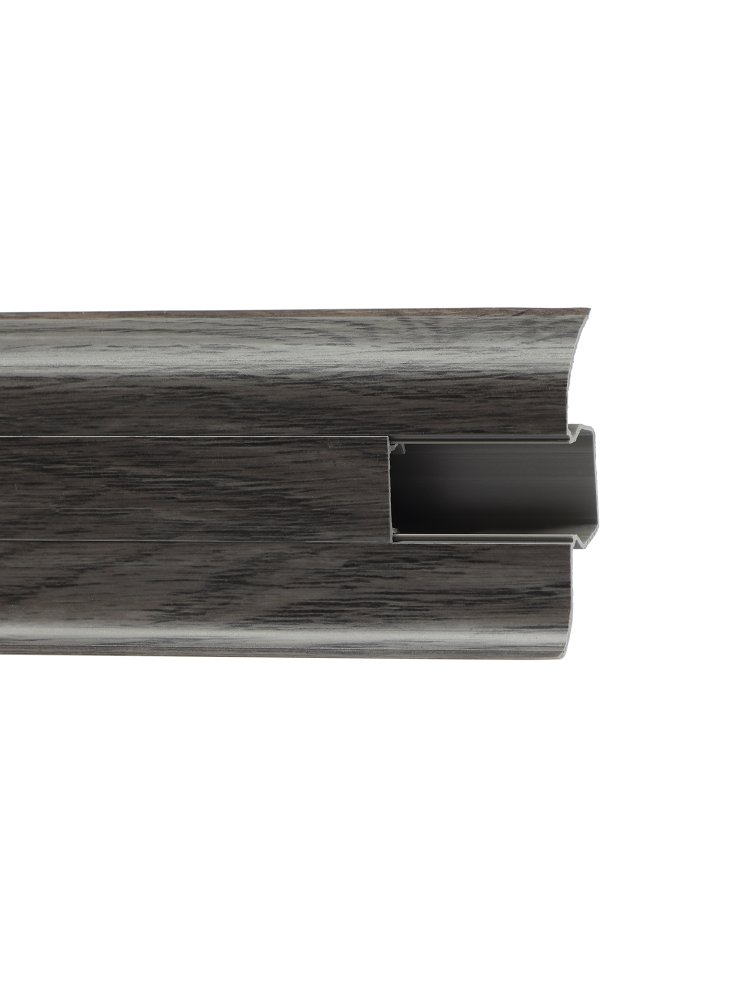 Утонченный и высокий профиль (58 мм) с острыми краями. Благодаря съёмной панели монтаж электрических проводов, покраска стен, оклеивание обоями возможны без демонтажа профилей. Конструкция позволяет монтировать и демонтировать плинтус без использования инструментов. Существует возможность размещения большого количества проводов, в том числе после монтажа. Специальная двухслойная технология: помимо слоя краски, дополнительно покрывается специальным лаком, благодаря чему его покрытие становится однородным, а это дополнительно защищает изделие от разного вида механических повреждений и вредного воздействия лучей УФ. Благодаря эластичному материалу, плинтус идеально прилегает даже к неровностям стен и полов. Пластиковый плинтус 58 мм, длина 2,5 м, защита от влаги, прочность, стиль дуб каменный, легко монтируется и скрывает провода.