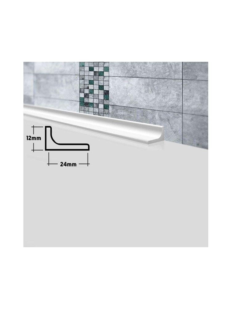 Служит для скрытия стыков между раковиной или ванной и стеной. Акриловый камень, из которого сделаны бордюры, очень плотный и прочный материал. В нем нет пор, поэтому в нём не заводятся плесень и грибок. Он прост в уходе, не боится влажности и бытовой химии, не меняет свой цвет и форму. Для распила потребуется ножовка по металлу или торцовочная пила с диском по дереву или алюминию, монтаж производится на герметик или водостойкий клей. Влагостойкий, акриловый бордюр для герметизации стыков, белый, 12×24×1800 мм. Лёгкий монтаж, защита от плесени и эстетичный внешний вид.