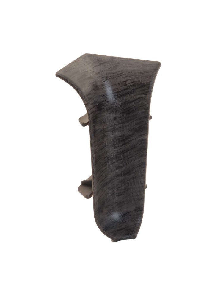 Утонченный и высокий профиль (58 мм) с острыми краями. Благодаря съёмной панели монтаж электрических проводов, покраска стен, оклеивание обоями возможны без демонтажа профилей. Конструкция позволяет монтировать и демонтировать плинтус без использования инструментов. Существует возможность размещения большого количества проводов, в том числе после монтажа. Специальная двухслойная технология: помимо слоя краски, дополнительно покрывается специальным лаком, благодаря чему его покрытие становится однородным, а это дополнительно защищает изделие от разного вида механических повреждений и вредного воздействия лучей УФ. Благодаря эластичному материалу, плинтус идеально прилегает даже к неровностям стен и полов. Декоративный уголок для плинтуса 58 мм в цвете дуб чернёный, скрывает стыки и защищает углы, прост в установке, в комплекте 2 шт.