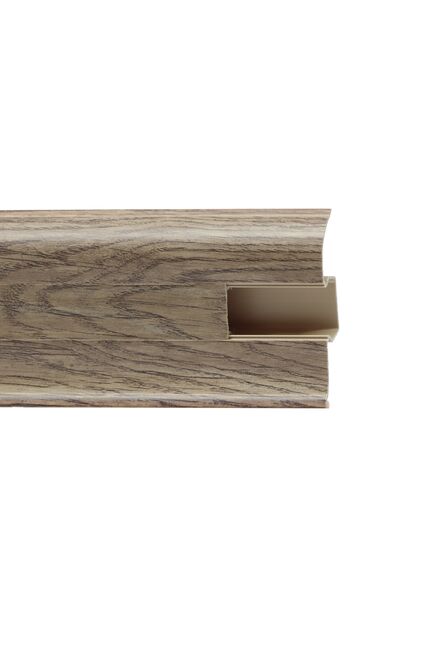 Утонченный и высокий профиль (58 мм) с острыми краями. Благодаря съёмной панели монтаж электрических проводов, покраска стен, оклеивание обоями возможны без демонтажа профилей. Конструкция позволяет монтировать и демонтировать плинтус без использования инструментов. Существует возможность размещения большого количества проводов, в том числе после монтажа. Специальная двухслойная технология: помимо слоя краски, дополнительно покрывается специальным лаком, благодаря чему его покрытие становится однородным, а это дополнительно защищает изделие от разного вида механических повреждений и вредного воздействия лучей УФ. Благодаря эластичному материалу, плинтус идеально прилегает даже к неровностям стен и полов. Внутренний уголок 58 мм, цвет "Дуб Элит", для аккуратных стыков плинтуса. Прочный пластик, простая установка, комплект 2 шт., имитация натурального дерева.