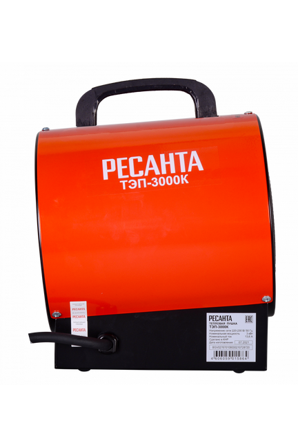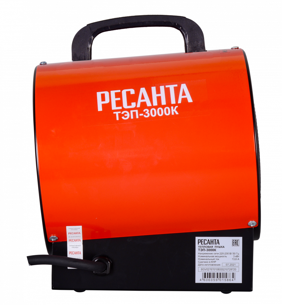 Тепловая пушка электрическая Ресанта ТЭП-3000К – мощный электроприбор, способный быстро прогреть большое помещение и поддерживать нужную температуру. Тепловая пушка Ресанта ТЭП-3000К, в которой в качестве нагревательного элемента служит ТЭН, произведена из прочного металла. Корпус имеет устойчивую опору, которая позволит избежать опрокидывания. Безопасность работы механизма обеспечивается функцией защиты от перегрева и встроенной решеткой, защищающей от попадания внутрь корпуса посторонних предметов. Тепловая пушка РЕСАНТА ТЭП-3000К, 3 кВт, круглая. Три режима работы, защита от перегрева, прочный корпус. Для обогрева и просушки помещений.