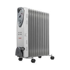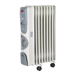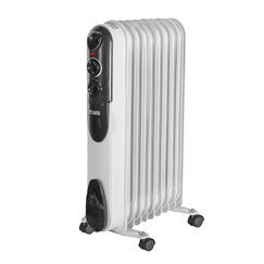 Масляный радиатор предназначен для обогрева воздуха в помещениях площадью до 25 квадратных метров. Термостат регулируется вручную при помощи удобной ручки. Переключение режимов обогрева осуществляется удобной ручкой. Световой индикатор предназначен для контроля рабочего состояния масляного радиатора. Для удобства перемещения конструкция прибора оснащена колёсами. Эффективный обогрев до 25 м², 3 режима мощности, встроенный вентилятор, термостат, 12 секций, защита от перегрева и опрокидывания.