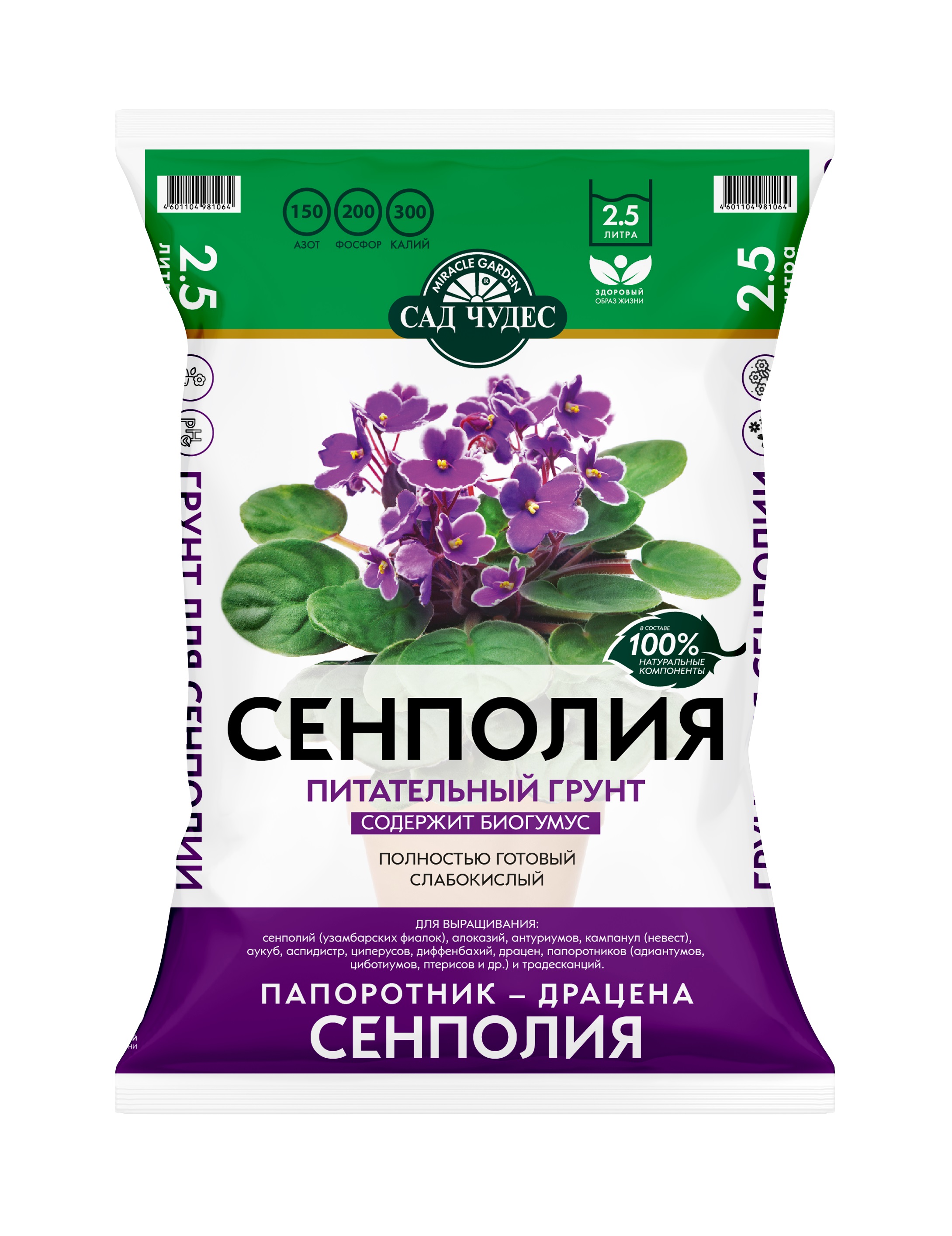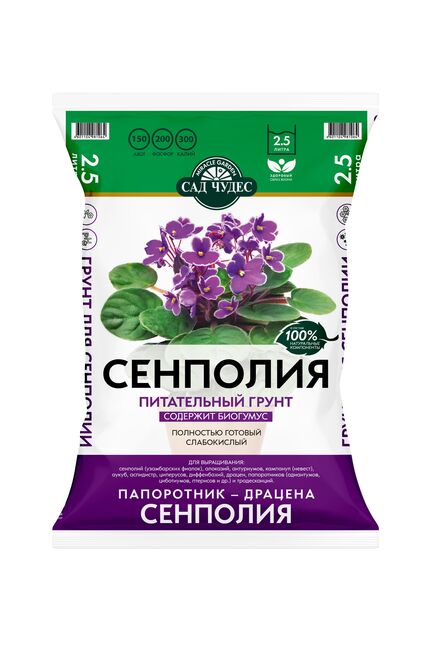 Питательный, рыхлый грунт 2,5 л для сенполий: обеспечивает быстрый рост, корнеобразование и обильное цветение домашних фиалок.