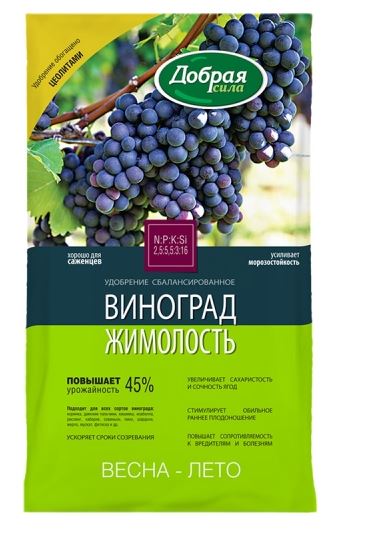 Удобрение сбалансированное для саженцев и взрослых растений. Подходит для всех сортов винограда: коринка, дамские пальчики, кишмиш, изабелла, рислинг, каберне, совиньон, пино, шардоне, мерло, мускат, фетяска и др. Повышает урожайность на 45%. Ускоряет сроки созревания. Стимулирует обильное раннее плодоношение. Увеличивает содержание сахаров в ягодах, повышает содержание витамина С и полезных аминокислот. Повышает сопротивляемость к вредителям и болезням
