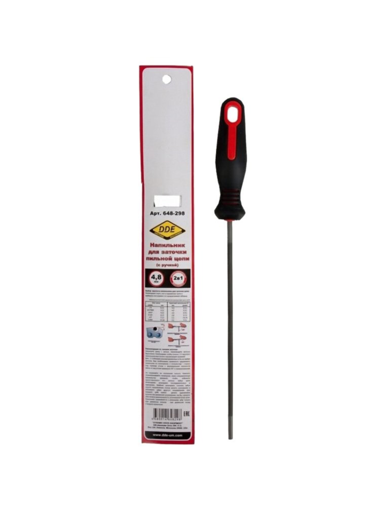 Напильник круглый с ручкой 4,8 мм - 3/16 DDE 648-298 используется при заточке и правке пильных цепей, не снимая их с бензопилы. Напильник подходит для заточки цепей с шагом 0.325". Пластиковая ручка удобно лежит в руке. Удобен для заточки цепей и точных работ. Диаметр 4,8 мм. Эргономичная ручка, прочная сталь, высокая износостойкость и простота использования.
