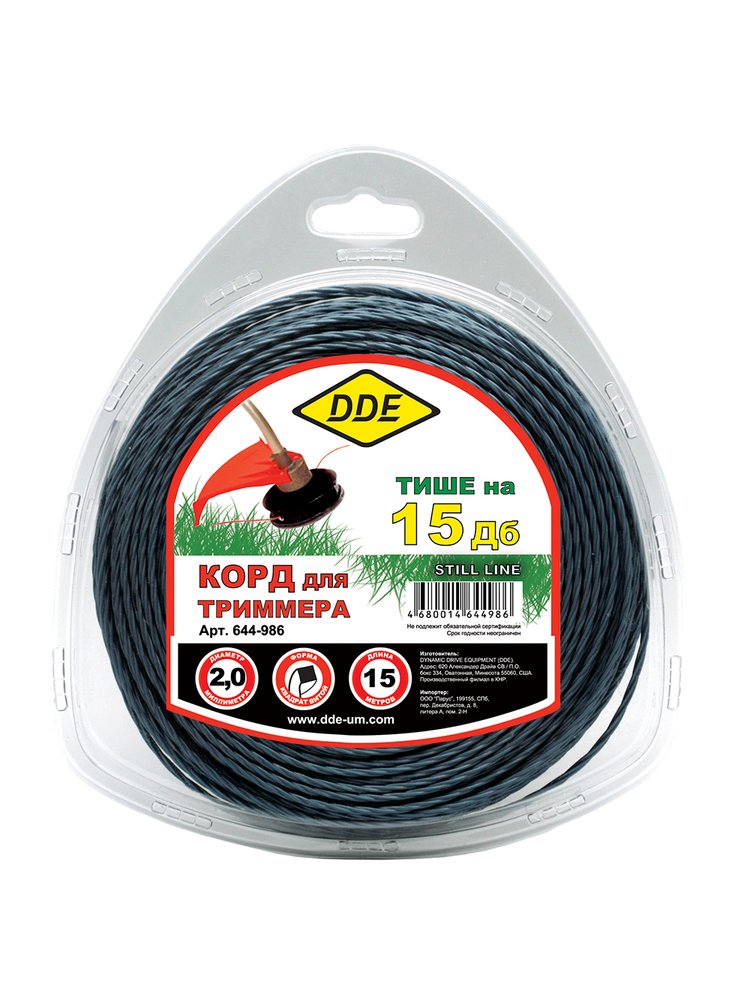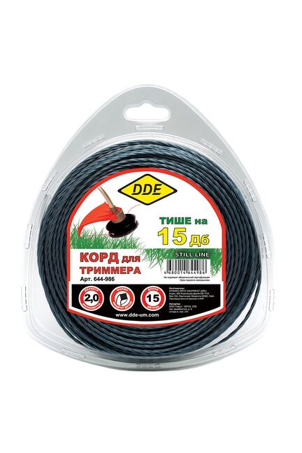 Триммерный корд DDE производится из материала сополимер-термопласт марки Luran S производимой мировым лидером, компанией BASF. Сечение - витой крест. Обладает высокой производительностью кошения и при этом пониженным шумом на 15Дб. Витой квадратный корд 2,0 мм х 15 м: долговечность, сниженный шум, высокая износостойкость. Отлично для триммеров при скашивании травы и сорняков.