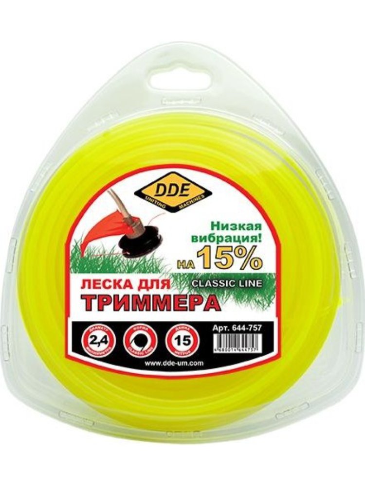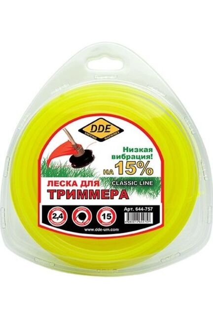 Корд триммерный Classic line DDE применяется при работе с триммерами для кошения травы. Является режущим элементом и заправляется в триммерную головку. Изготовлен из износостойкого сополимер-термопласта марки Luran S. Выдерживает интенсивную эксплуатацию на высоких оборотах. Обладает пониженной вибрацией. Износостойкий корд для триммера 2,4 мм, 15 м, круглый профиль, нейлон, долговечен, для скашивания газонов и травы.