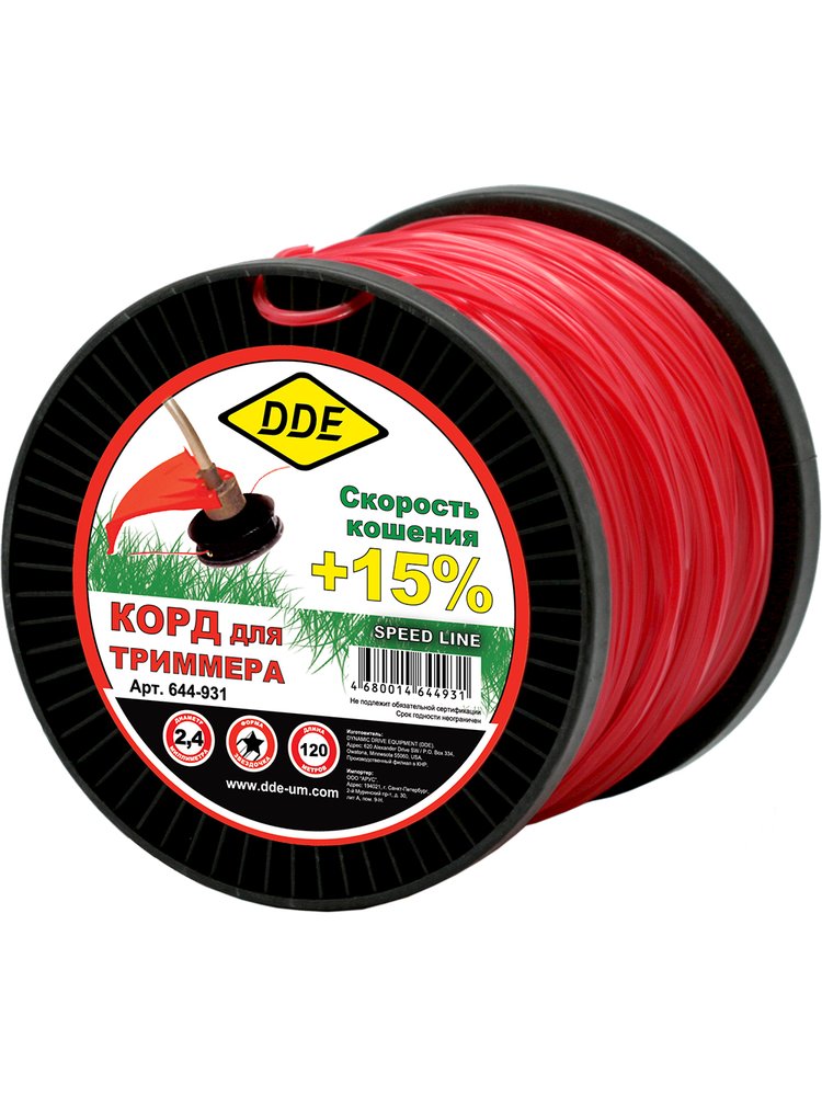 Триммерный корд DDE производится из материала сополимер-термопласт марки Luran S производимой мировым лидером, компанией BASF. Сечение-пятиконечная звезда. Корд 2,4 мм для триммеров: эффективный срез, высокая износостойкость, длина 120 м для экономичного применения.