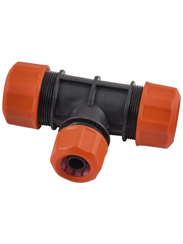 Цанговый тройник для труб 1/2" и 3/4", легко монтируется без инструментов, обеспечивает герметичность, подходит для систем полива и водоснабжения.